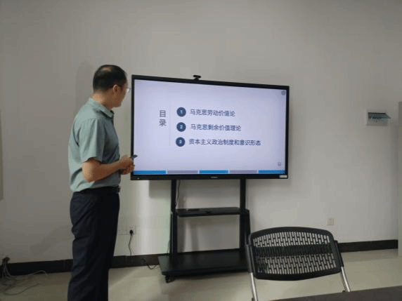 会议第一阶段,主讲人讲课。李忠老师介绍的主题是“合理设计专题五资本主义本质的重点与难点,破解内容多与课时少的矛盾”。李老师从教学大纲的要求出发,合理分配课时数,概括出劳动价值论的“四个矛盾”“两大规律”和“一个认识”的重难点,并紧紧围绕剩余价值的产生条件、生产方法、流通方式和积累后果重难点的分析,得出资本主义必然灭亡的发展趋势。