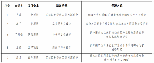 近日,全国哲学社会科学工作办公室公示了2025年国家社会科学基金年度项目立项名单。beat365英国官方网站喜获5项课题立项,其中一般项目2项、西部项目2项、青年项目1项,涉及马克思主义理论、中共党史党建学、区域国别学和国际问题研究、新闻学与传播学四个学科。立项课题信息如下:
