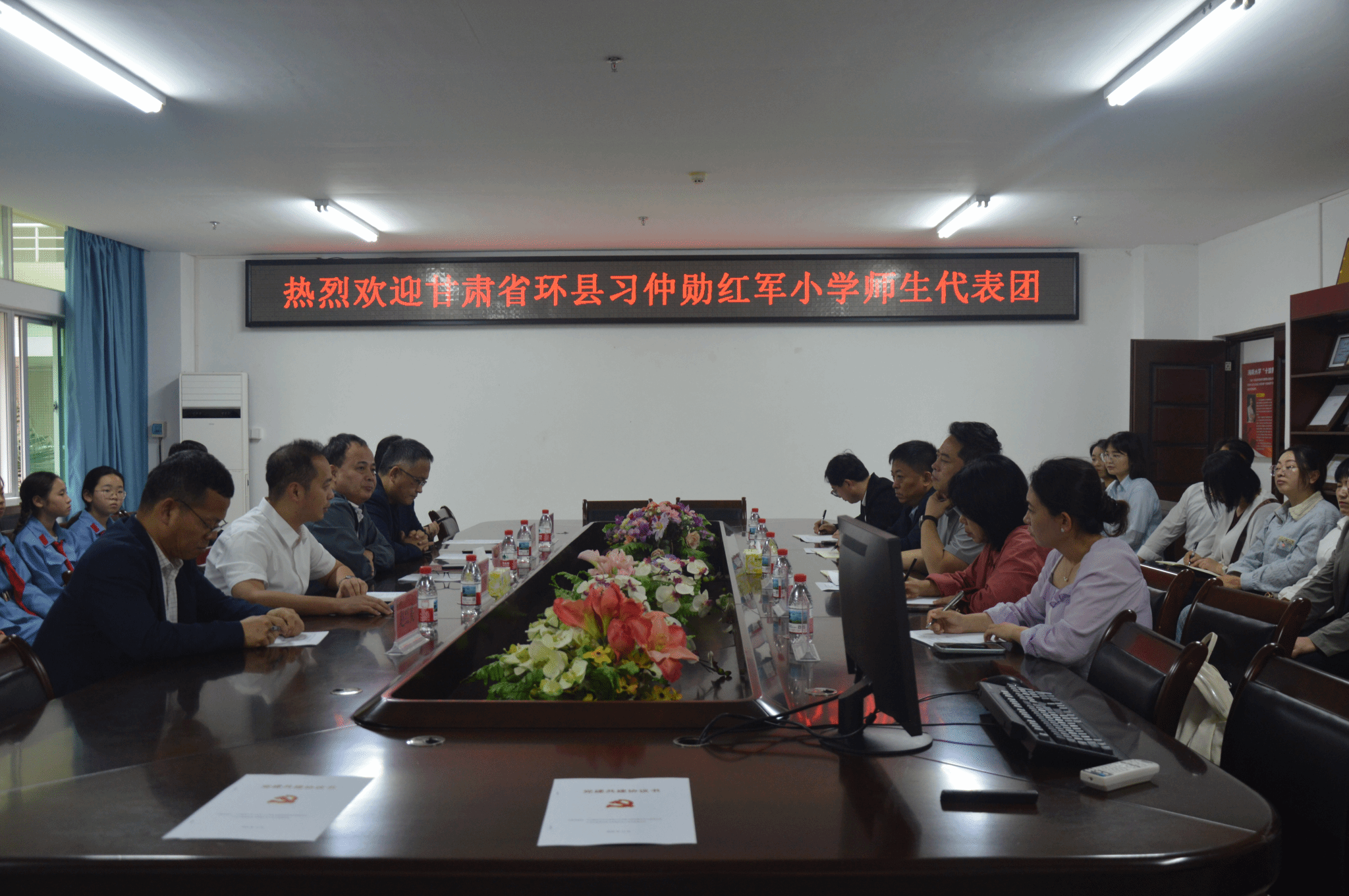 beat365英国官方网站副院长蔡文举、王一闳;环县习仲勋红军小学副校长杨志科;双方师生代表参加会议。