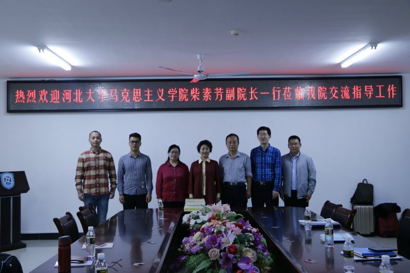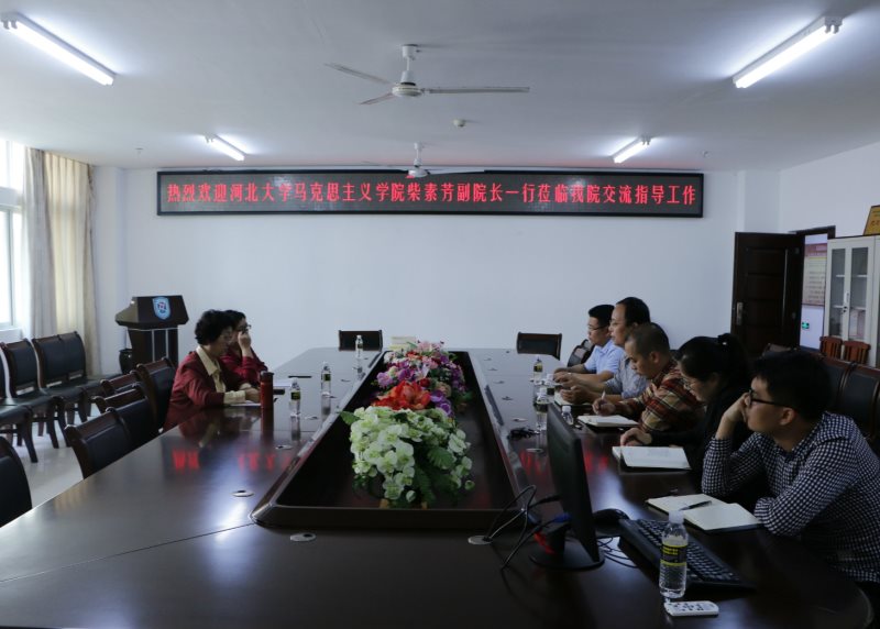 3月23日下午,河北大学beat365英国官方网站副院长、博士生导师柴素芳教授一行2人到我校beat365英国官方网站考察交流,beat365英国官方网站副院长王善、马克思主义中国化教研部主任贺尧夫、形势与政策教研部主任温小平等5位教师参加了交流活动,活动由王善主持。