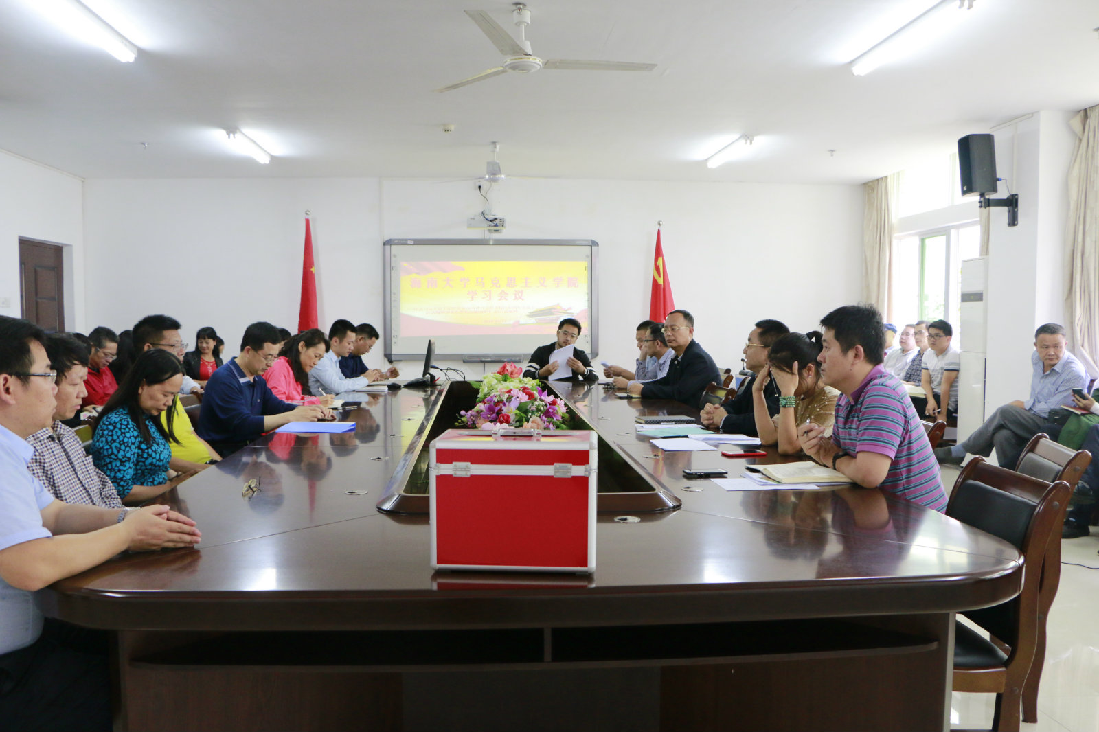 4月17日下午,beat365英国官方网站在学院会议室召开全体教职工大会。会上,院党委书记段捷频传达学习了习近平总书记在庆祝海南建省办经济特区30周年大会上的重要讲话、《中共中央国务院关于支持海南全面深化改革开放的指导意见》和省委常委会(扩大)会议精神,并就各党支部全面开展相关学习活动作出具体安排和部署。