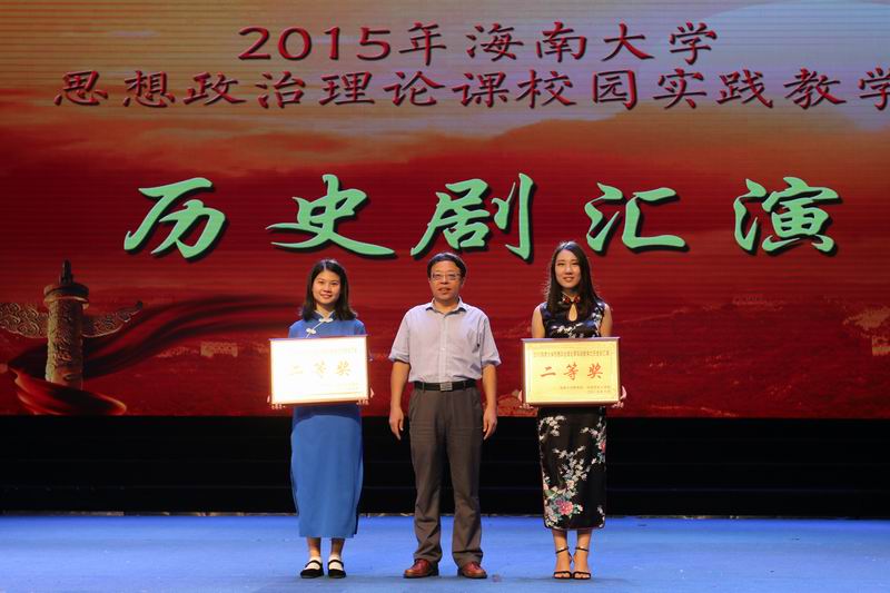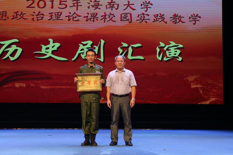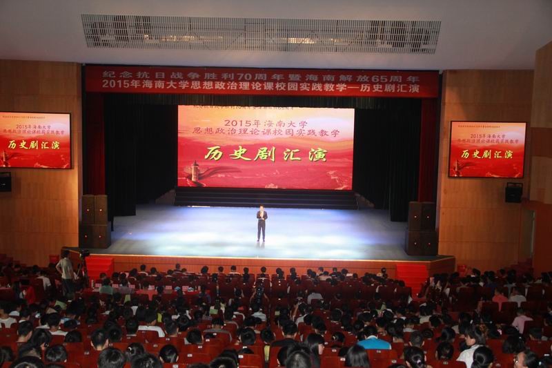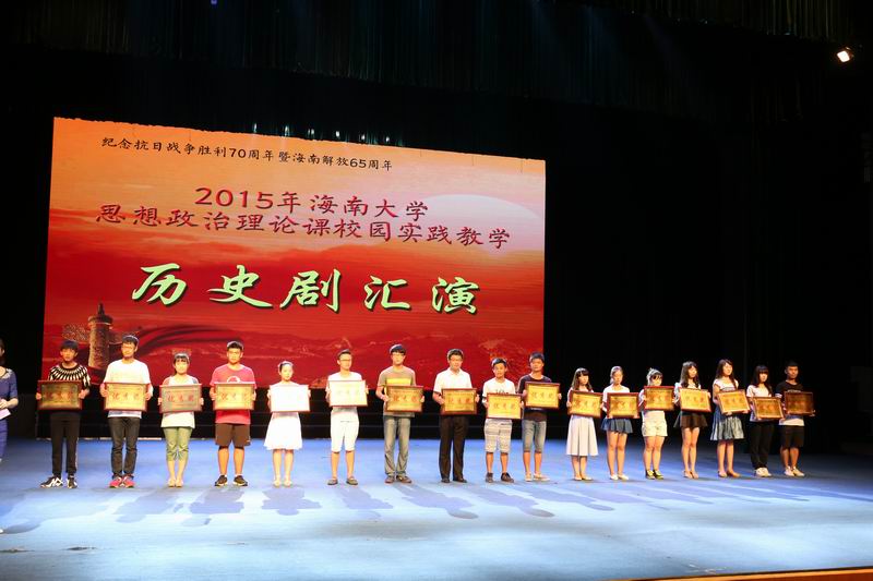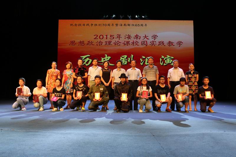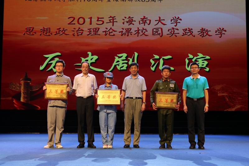 6月2日下午,由我校beat365英国官方网站主办,以纪念抗日战争胜利70周年暨海南解放65周年为主题的思想政治理论课校园实践活动——历史剧汇演在思源学堂举行。海南省委宣传部副部长郭志民,海南省委宣传部理论处处长温龙、海南省教育厅思政处处长文强,我校副校长王崇敏出席活动,来自全省18所高校思想政治理论课教学部门负责人及骨干教师60余人参与了现场观摩。 历史剧表演活动在《中国近现代史纲要》课堂上已经开展了3个月,此次参加汇演的6个剧目是从2014级不同专业的8000多名大学生自编、自导、自演的354个剧目中精选而出的。剧目主题鲜明,选材合理,内容积极向上,意义深刻。同学们表演形象逼真,动作到位,神态自然大方。演出过程中剧情衔接良好,整体效果佳,观众不时爆发阵阵掌声。 汇演结束后, 海南省委宣传部副部长郭志民和beat365英国官方网站副校长王崇敏分别为获一、二等的同学颁奖,海南省委宣传部理论处长温龙、海南省教育厅思政处处长文强和我校教务处处长欧阳克毅共同为获三等奖的同学颁奖,欧阳克毅对汇演进行了精彩的专家点评。 此次活动吸引了多家媒体的高度关注,新华网、中新网、海南日报均对此事进行了报道。兄弟院校观摩教师对此项活动寄予了高度的评价。学校党委领导对活动的开展给予关心和指导,校党委办公室、宣传部、教务处、艺术学院、团委、艺术团、网教中心等部门给予了大力的支持与配合。 学校教务处处长欧阳克毅、校党委宣传部副部长谭勇、beat365英国官方网站领导班子全体成员和部分学院分管教学副院长参加了活动。 据悉,beat365英国官方网站思想政治理论课教学团队经过多年理论研究与实践探索,成功构建了“一主三辅”实践教学模式,2014年,该项目入选教育部思想政治理论课教学方法改革择优推广计划。目前,该项目是海南省委宣传部和beat365英国官方网站共建beat365英国官方网站的重要内容,是海南省教育厅重点推广项目。此次的历史剧汇演是“一主三辅”实践教学模式中“校园实践”教学的重要内容。