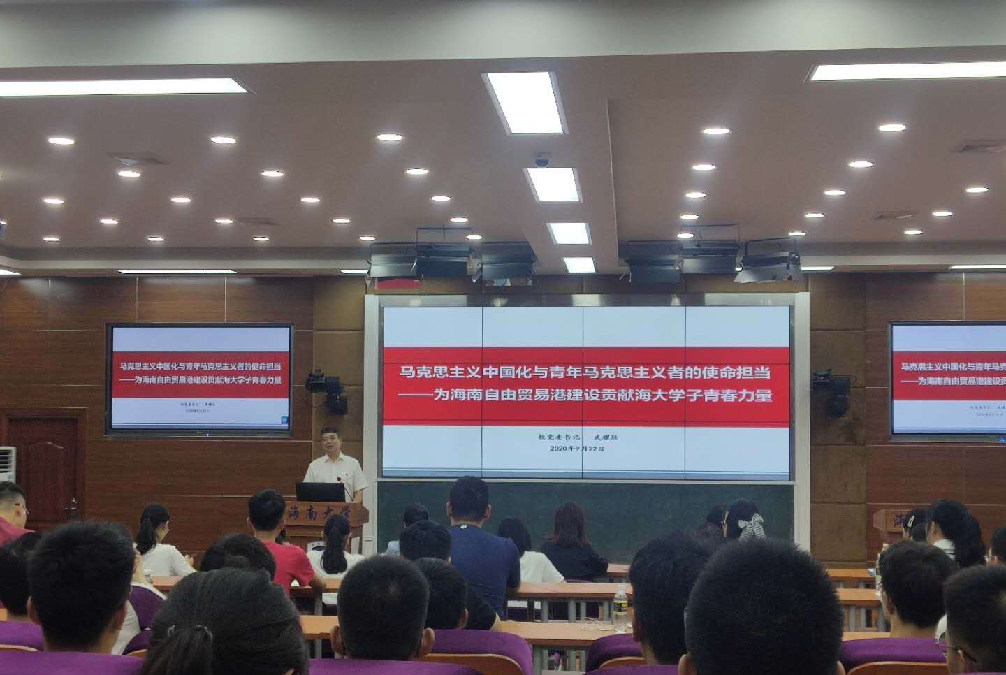 9月22号下午,beat365英国官方网站党委书记武耀廷走进“开学第一课”,在3号教学楼211教室为beat365英国官方网站2020级全体本科、研究生新生和部分学生骨干、思政课教师讲授“马克思主义中国化与青年马克思主义者的使命担当——为海南自由贸易港建设贡献海大学子青春力量”。
