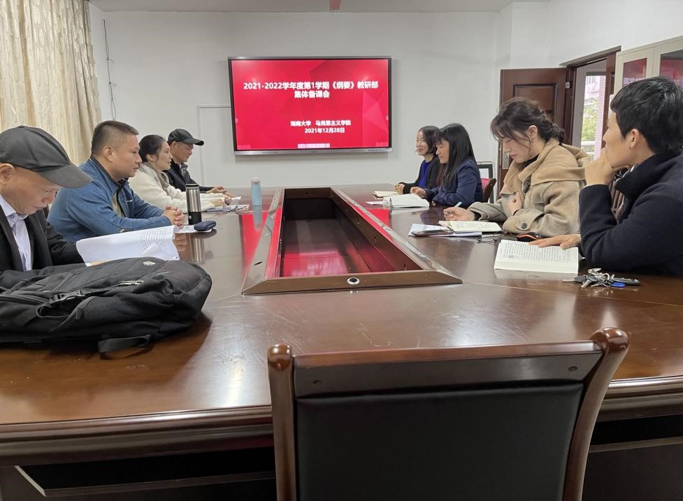 会上,教研室老师们紧扣2021版《纲要》教材与计划明年参加教学比赛的王嘉南老师一起逐章梳理知识点,寻找切入点,挖掘教学资料,缕教学思路。每位老师知无不言言无不尽,毫无保留地提出了自己的见解和建议。在2个多小时的集体备课活动中,纲要教研室始终围绕明年的教学比赛讨论研究,总结经验,集思广益,以期发挥集体的智慧,弥补个体的不足。