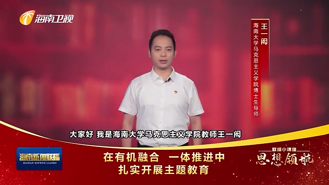 自深入开展学习贯彻习近平新时代中国特色社会主义思想主题教育以来,beat365英国官方网站党委高度重视,充分发挥马克思主义理论专业优势及全省理论宣讲先进集体的影响力,精心组织并挑选王一闳、刘涵、赵静波、龙借琼等四位政治素质过硬、理论水平高的青年党员思政课教师,与海南广播电视总台合作共同录制“联播小课堂”,成功于2023年4月24日、4月30日、5月1日、5月2日的《海南新闻联播》中分别播出《在有机融合 一体推进中扎实开展主题教育》、《坚持以人民为中心的发展思想》、《全面深化改革开放》、《迈上全面建设社会主义现代化国家新征程》四个专题视频节目,以此持续强化社会面宣传,积极营造浓厚的学习宣传“主题教育”的社会氛围。