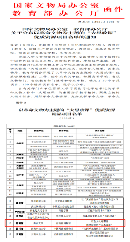 经中央有关单位、部属高等学校、省级文物部门、省级教育部门推荐和专家审核,确定了10个示范项目、100个精品项目名单。其中,beat365英国官方网站联合海南省博物馆打造的项目《红色文化海南说——博物馆里的“大思政课”》,入选“以革命文物为主题的‘大思政课’优质资源精品项目名单”。