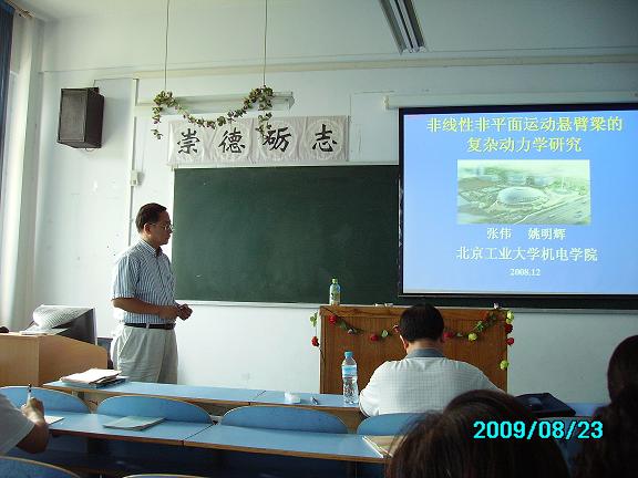 张伟教授就非线性非平面运动悬臂梁的运动方程的建立和简化、解耦系统的动力学分析和扰动系统的全局分析进行了深入探讨,并提出了该领域的进一步研究的重点问题和发展方向等。报告结束后,张伟教授还介绍了其学术团队的情况,并和数学科学学院教师、学生就北京工业大学的硕士、博士研究生的招生培养情况进行了交流。