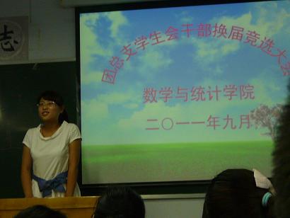 随后,本届学生会换届选举正式开始,首先按照抽签顺序由近20名参选选手依次上台发表竞选演讲,展开激烈的公平角逐。选手们纷纷表达了自己对学生会工作的看法,表示将以积极的工作态度和饱满的工作热情为数学与统计学院这个大家庭做一些力所能及的事情。他们那青春的热血,年轻的风采以及慷慨的陈词,激情的话语博得台下观众的阵阵掌声。